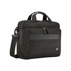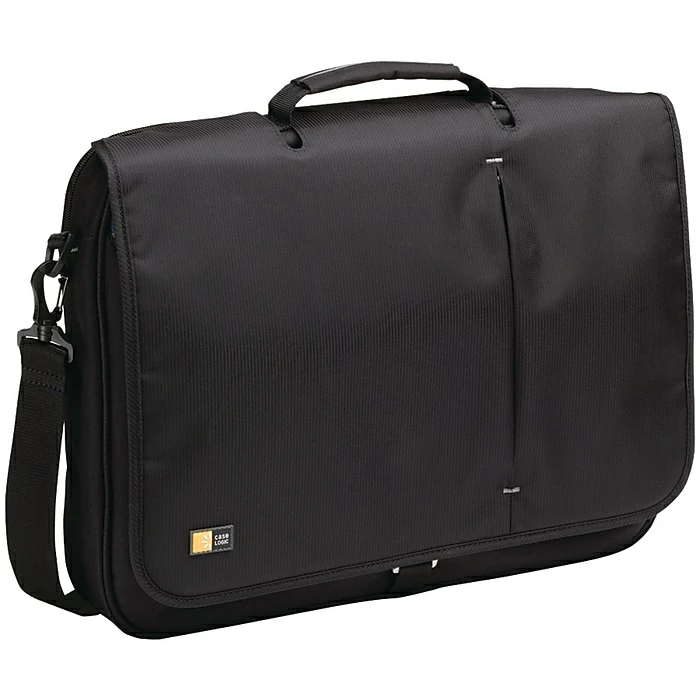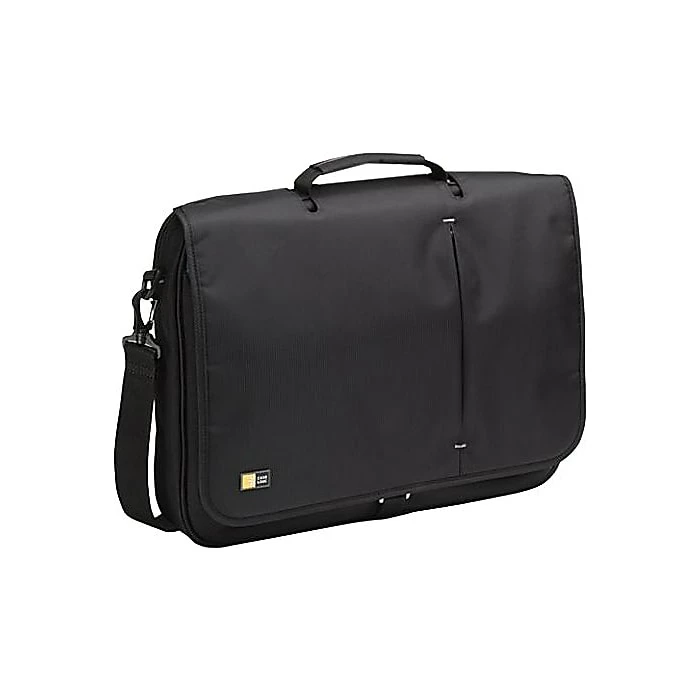 Case logic® 17″ Notebook messenger bag in black color features padded laptop pocket with zipper on the back, storage space under the flap, accessory pocket and integrated USB pocket. Bag has detachable shoulder strap, padded handle and luggage strap.