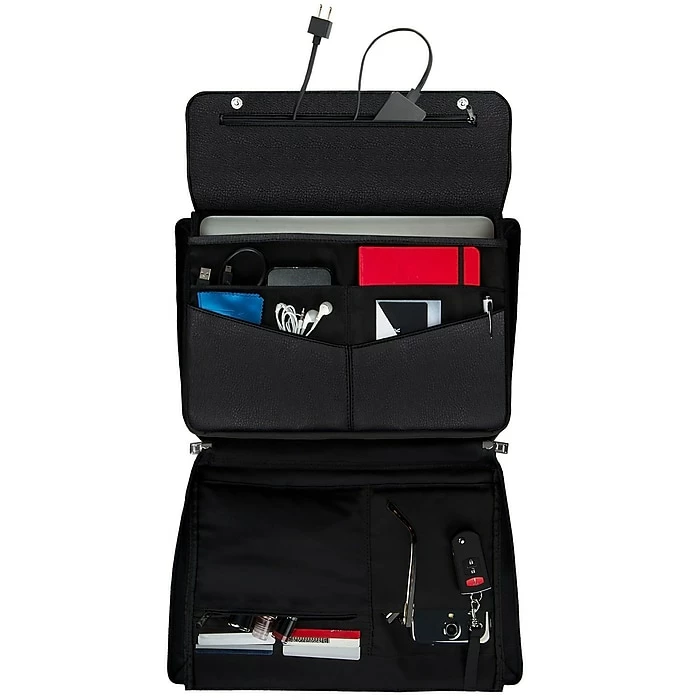 - Unique drop down zippered organizer. Side 1 includes; key chain clip, 6 credit card slots, zippered pouch, 2 larger pockets for your phone, glasses, etc. Side 2 includes; designated laptop pouch and 2 large pockets for external hard drives or smaller notebooks, and 2 smaller pockets for pens, headphones, etc.