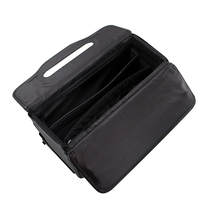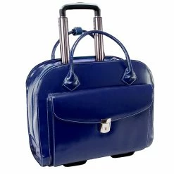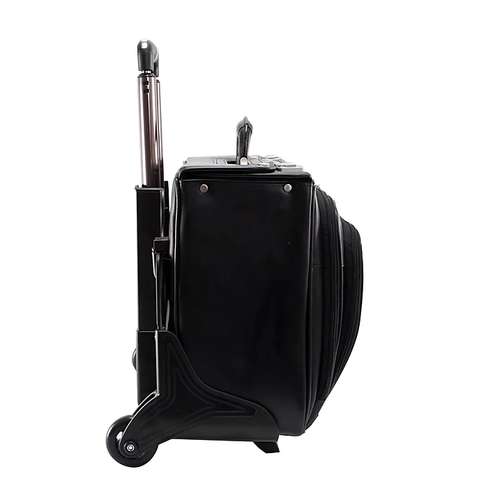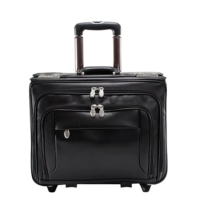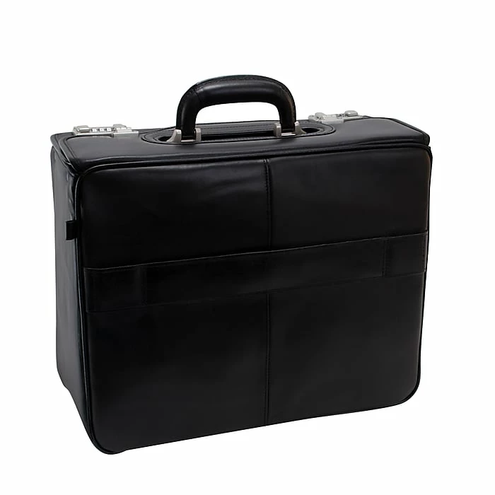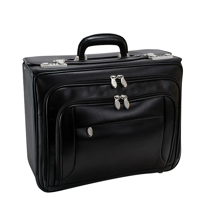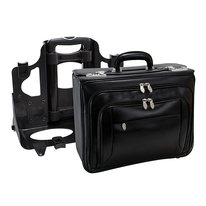 Briefcase with patented Detachable Wheel and Handle System features dual three-digit secured combination locks. S