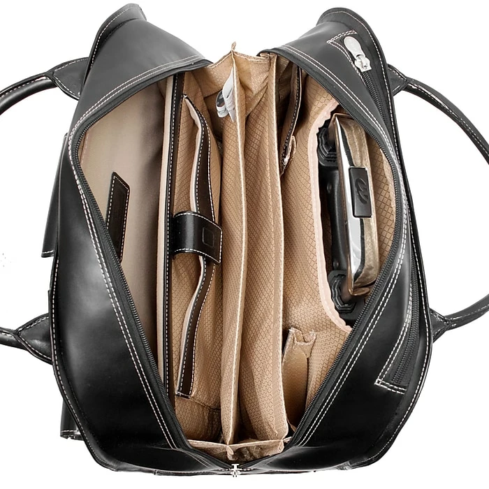 Briefcase features quick access front pocket secured with a key lock. Small front pocket secured by flap with turn lock. Interior organizer with storage space for media devices, business cards, key holder and pens. Double compartment divided by secured zipper pocket for important documents. Built-in high-density laptop compartment that protects laptops up to 15″ in size. Tablet pocket. Smart Strap allows easy transport on extended handles of other rolling cases and luggage.