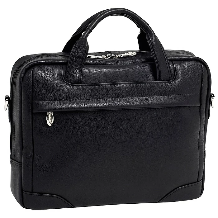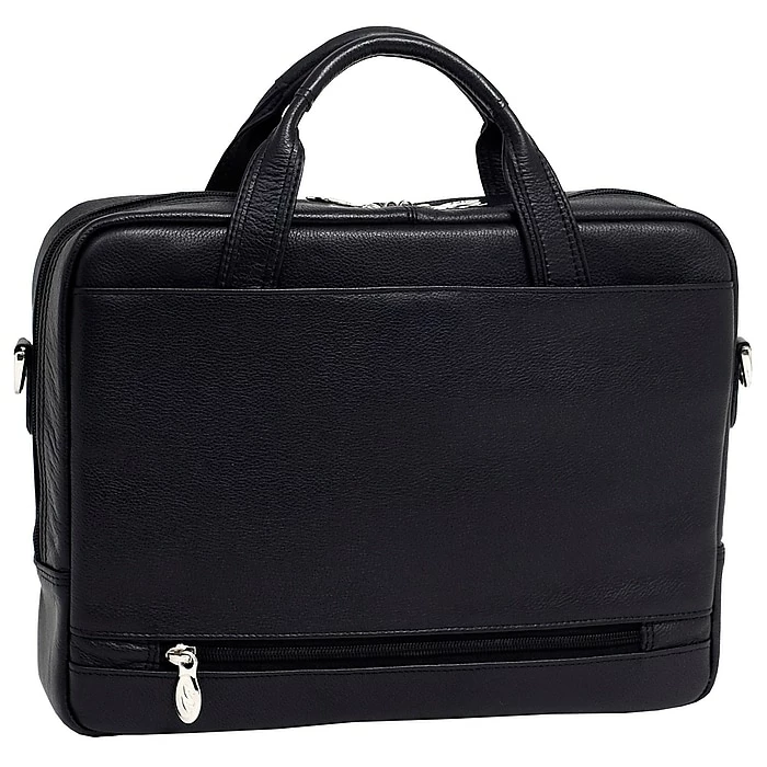 Front zipper pocket holds small accessories. Main zipper compartment features an interior organizer for pens, business cards and small devices.