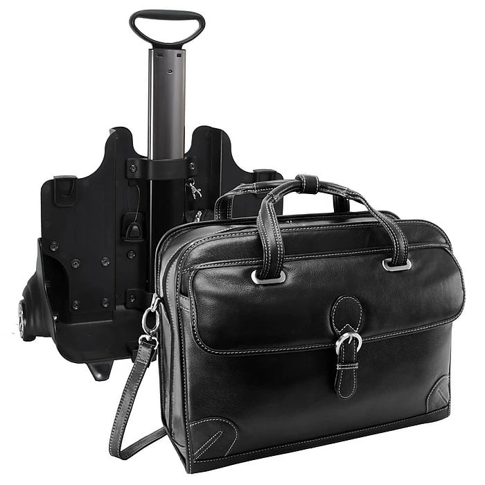Patented 2-in-1 Removable Wheel and Handle System briefcase with quick, accessible front pocket with a magnetic clasp for files and accessories.