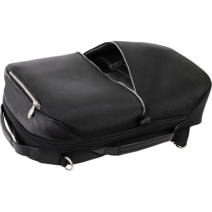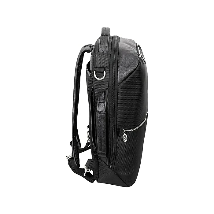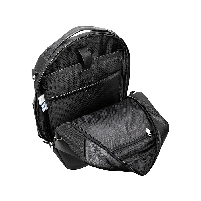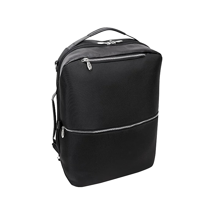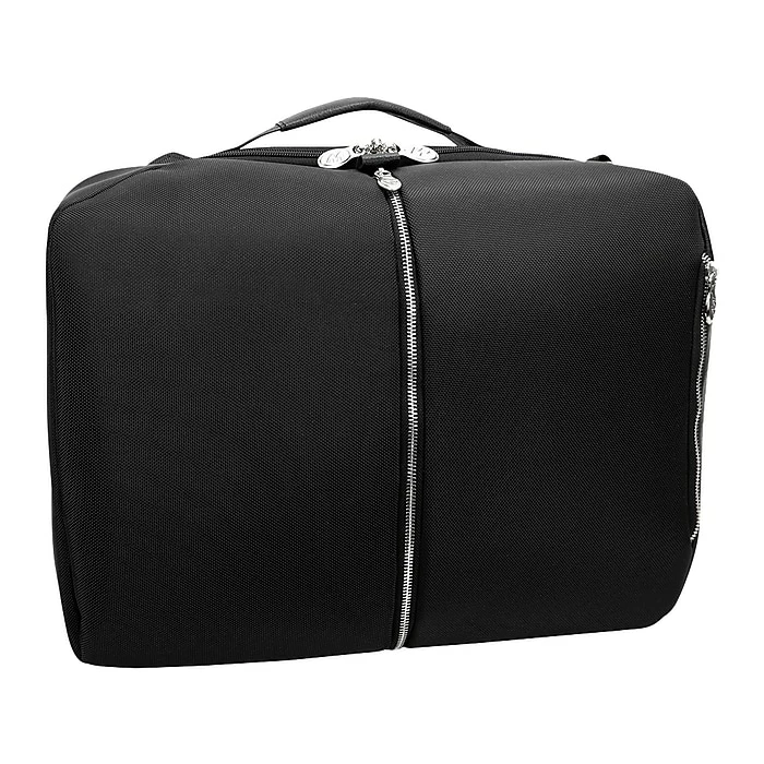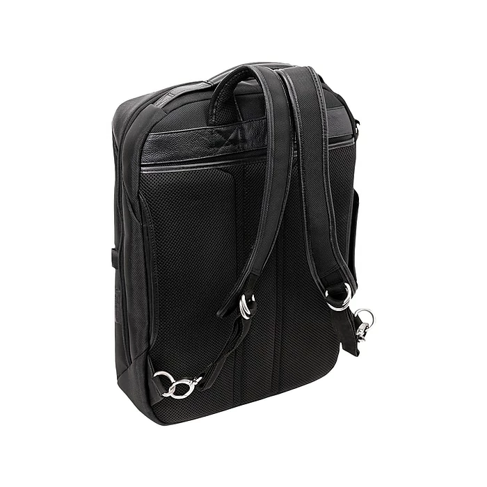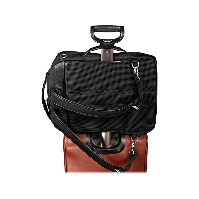 This McKlein U Series East Side versatile 18″H convertible travel backpack and messenger bag can carry you to your next trip fully prepared. Multiple options for the way you can carry your essentials with top or side carrying handle. Keep your business items easily accessible in the front horizontal zipper compartment with interior accessory organizer. The backpack boasts a top pocket with exterior and interior access to store cellphones and keys. Safely store your important devices in the interior built-in padded 17″ laptop sleeve or the secure tablet pocket. Storage has never been easier in the fully lined interior with leather trim and silver hardware. Rear exterior features ultra-padded air mesh with air flow system (AFS) and padded backpack straps. Store it on a rolling case for easier transport with the piggyback strap. Comes with a detachable non-slip, adjustable, padded strap for shoulder carry.
