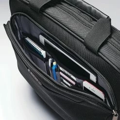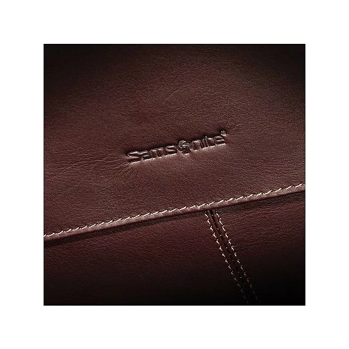 Ensure reliable, portable storage for business essentials with this brown laptop briefcase. Its leather finish and padded interiors offer durability to safely fit a 15.6-inch device and file folders, while the flap design adds stylish protection. Enjoy flexible carrying options with the traditional top handle and removable strap of this Samsonite laptop briefcase.