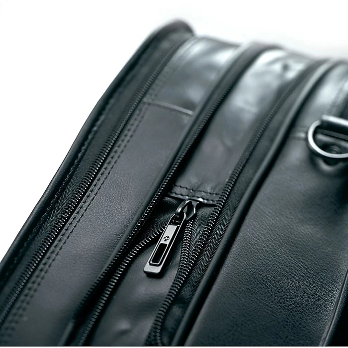 Carry your laptop or tablet, important paperwork, pens and anything else you need for your business day in this leather expandable briefcase. Two front zipper pockets keep frequently used items organized and easily accessible, while the other compartments expand to accommodate thicker items, including a laptop or tablet with a screen size of 15.6 inches or less. This classic black genuine leather briefcase features top carrying handles and a padded shoulder strap, allowing you to carry it comfortably.