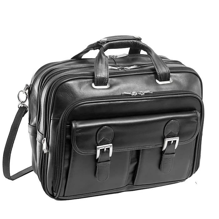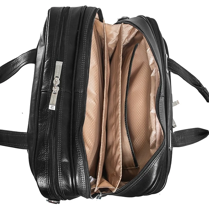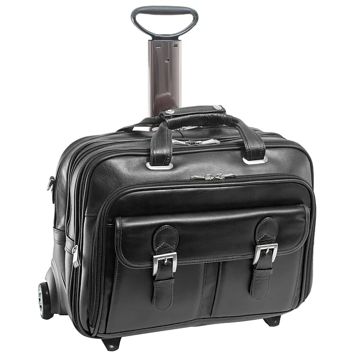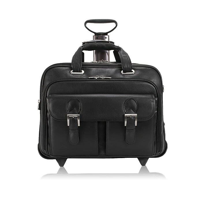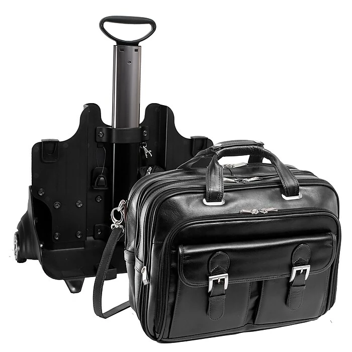 Secure, detachable patent pending Fly-Through Checkpoint-Friendly laptop sleeve design. Detachable laptop sleeve can be used as a separate case with detachable shoulder strap design. Laptop sleeve padded with high-density foam fits most laptops 15.6” in screen size. Patented 2-in-1 Removable Wheel and Handle System. Front compartment features file divider and space for documents. Flap-over design with slip-lock clasps features two front pockets for small miscellaneous items.