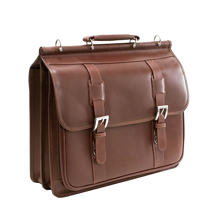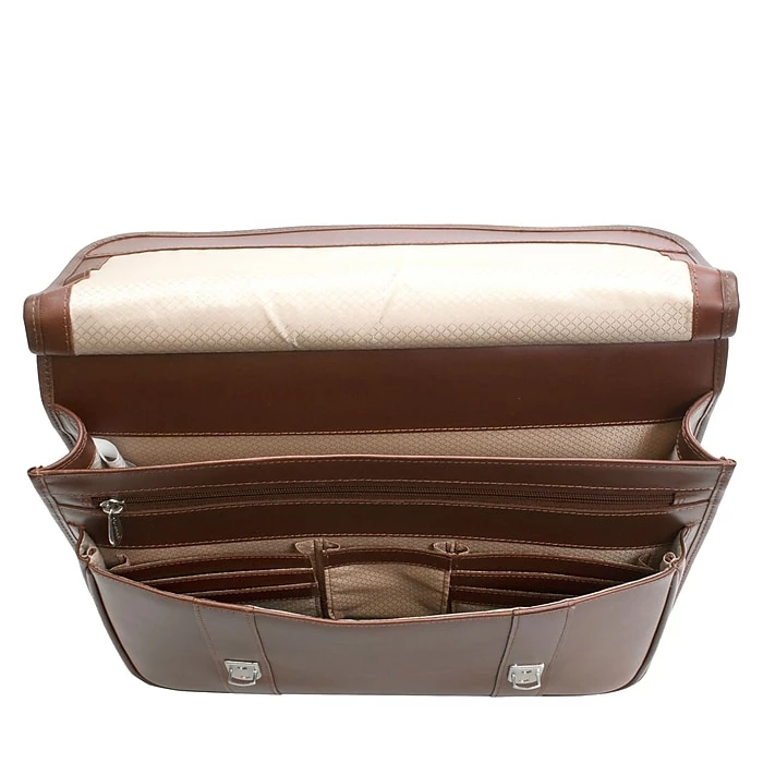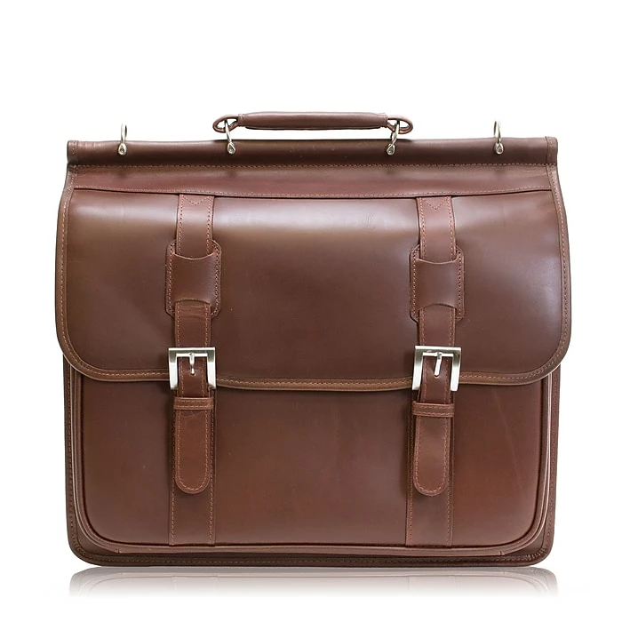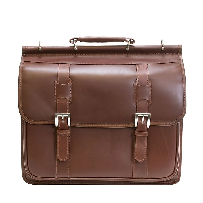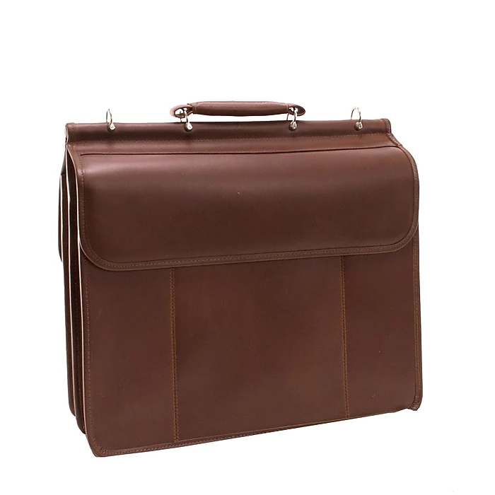 Flap-over, bar-top design briefcase with dual slip lock clasps.
