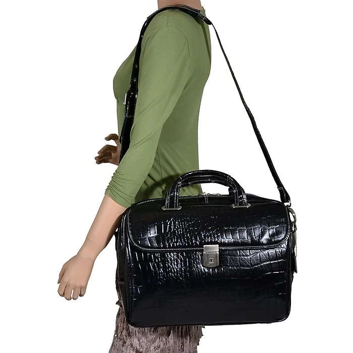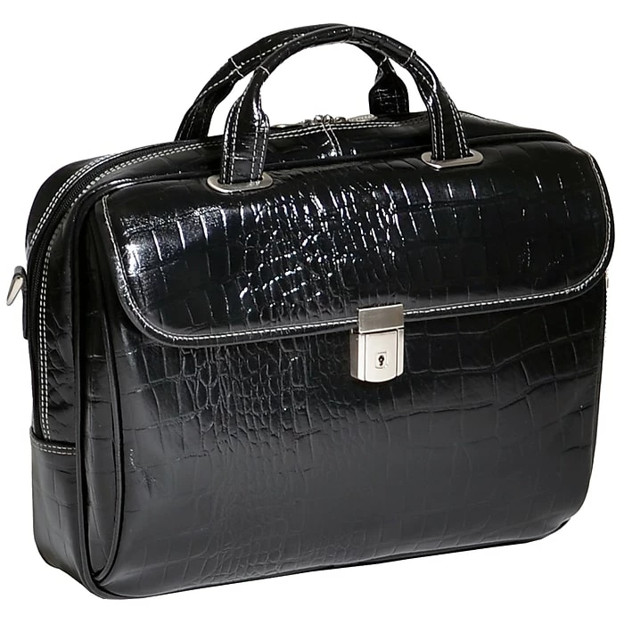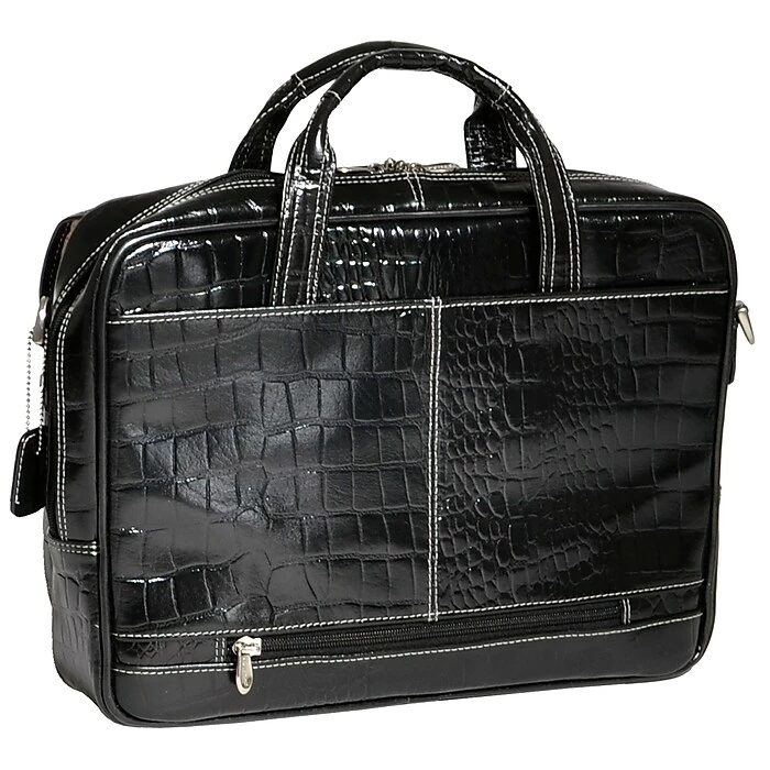 Briefcase features quick, accessible front pocket with clasp and two small accessory pockets.