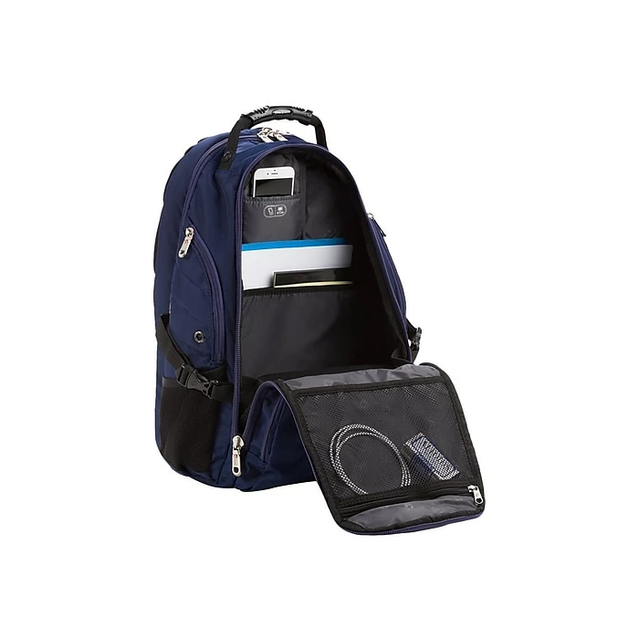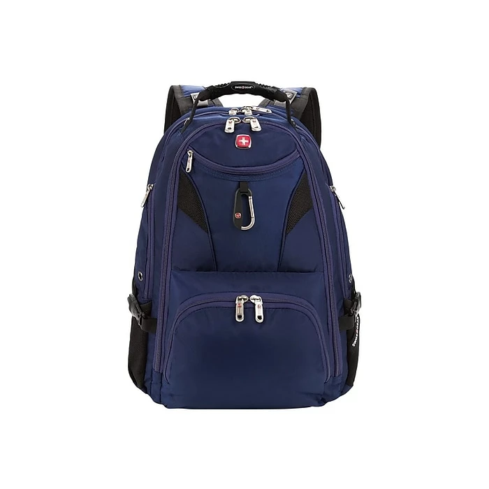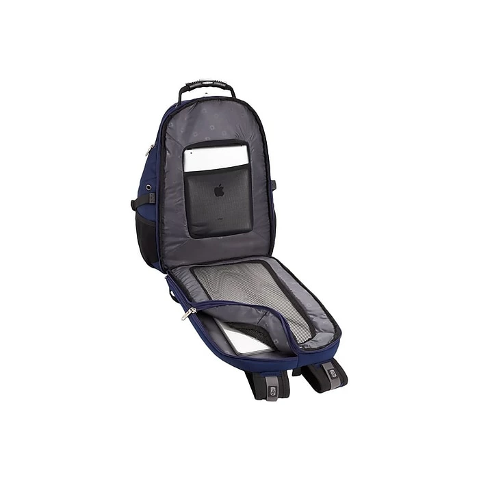 A favorite for those who wish to modify their bag, the Swissgear 5977 ScanSmart Laptop Backpack features a clean front panel designed specifically to accept custom embroidery of up to 5″ in diameter. Built with signature ScanSmart technology, your devices remain protected in a lay-flat compartment that has a 17″ laptop pocket and a floating TabletSafe sleeve. The main compartment features a file accordion and a mesh zip pocket to store important papers, books, and everyday essentials. The exterior boasts an organizer pocket to quickly store and access office supplies, travel documents, your ID and keys. Stash additional items inside a u-shaped front pocket and store your water canteen inside large side pockets. An inner media pocket lets you nestle your smartphone and connect your earbuds to a headphone port so you can listen to your playlist hands-free. Side compression straps, ergonomic shoulder straps, and Airflow padding contour to your physique for all-day comfort. Plus, a heavy-duty molded handle befits grab-and-go mobility.