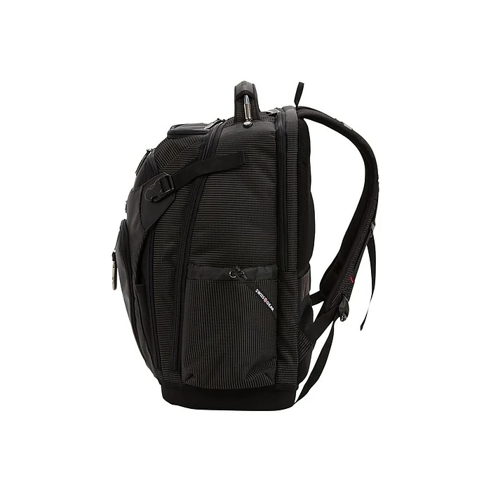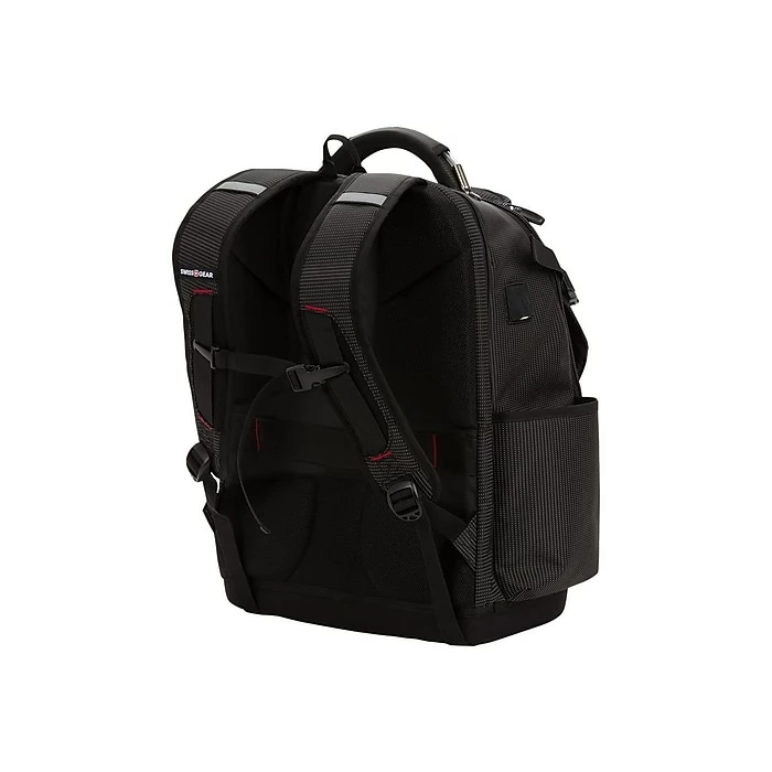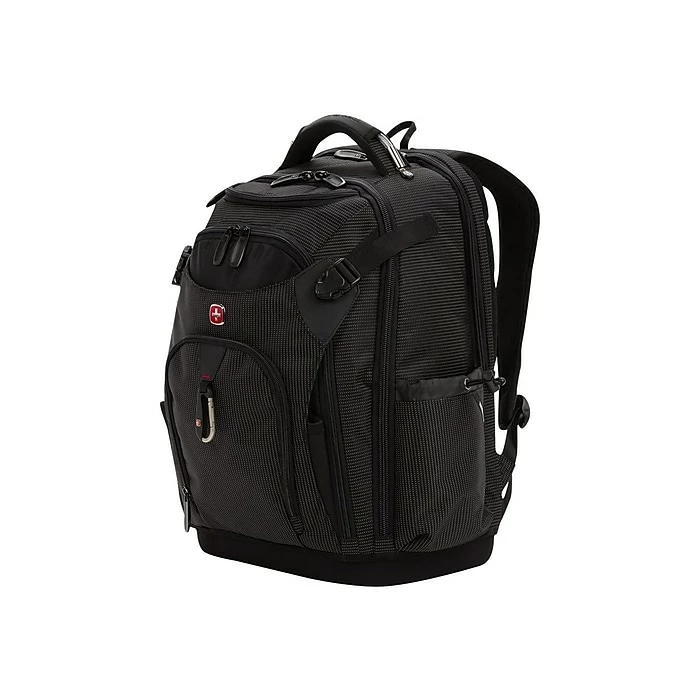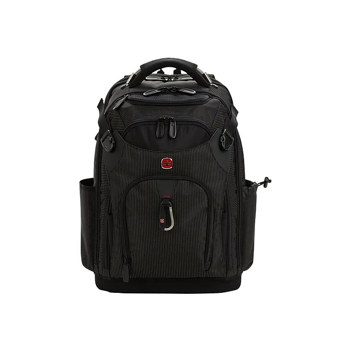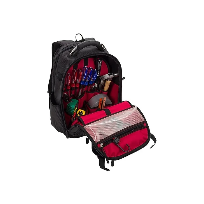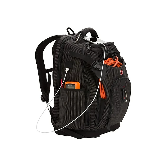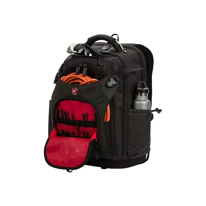 Engineered to carry all your work tools and devices, this Swissgear 3636 USB Work Pack Pro Tool Backpack combines the portability of a toolbox with the modernity of a backpack. Its rugged construct features a designated 17″ laptop compartment, a built-in USB port, and three zip compartments with more than 60 organizer slots for hand tools, nails, hammers, and drills. An external front pocket integrates 20 divider slots to accommodate a range of tool sizes while a second zip pocket includes two large slip pockets and multiple slots to store a measuring tape, rulers, screwdrivers, and other supplies. Inside the main compartment, find a removable grab-and-go tool caddy as well as a wet/dry PVC pocket and a hook and loop closure pocket. Stash large cable cords inside a front slip section and protect your safety glasses inside a hard-molded top pocket. A side cinch water bottle pocket along with an Airflow technology back panel and shoulder straps provide lasting comfort on the worksite. An EVA molded hard bottom keeps this pack standing upright so you can reach in and out of each compartment seamlessly.