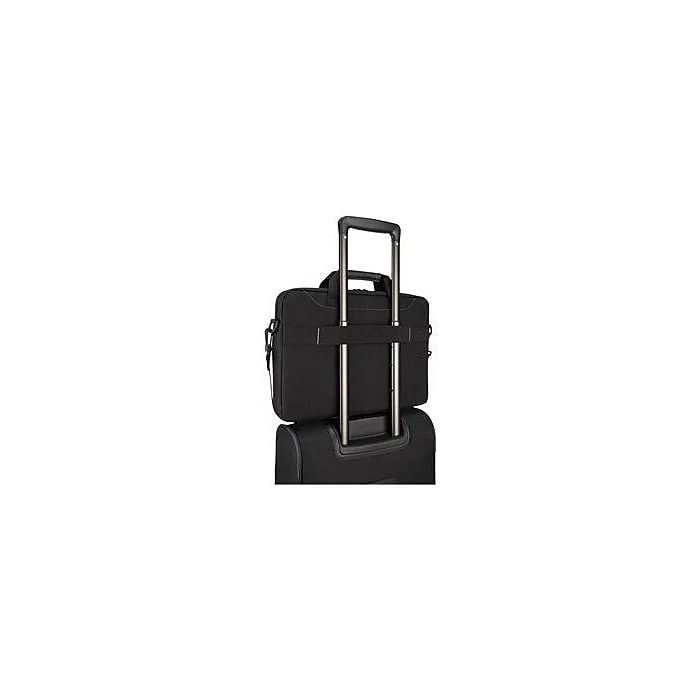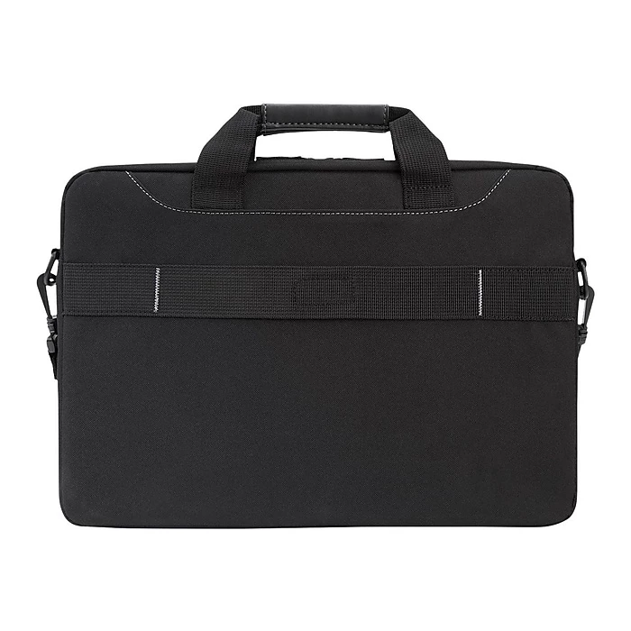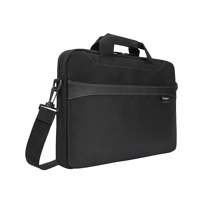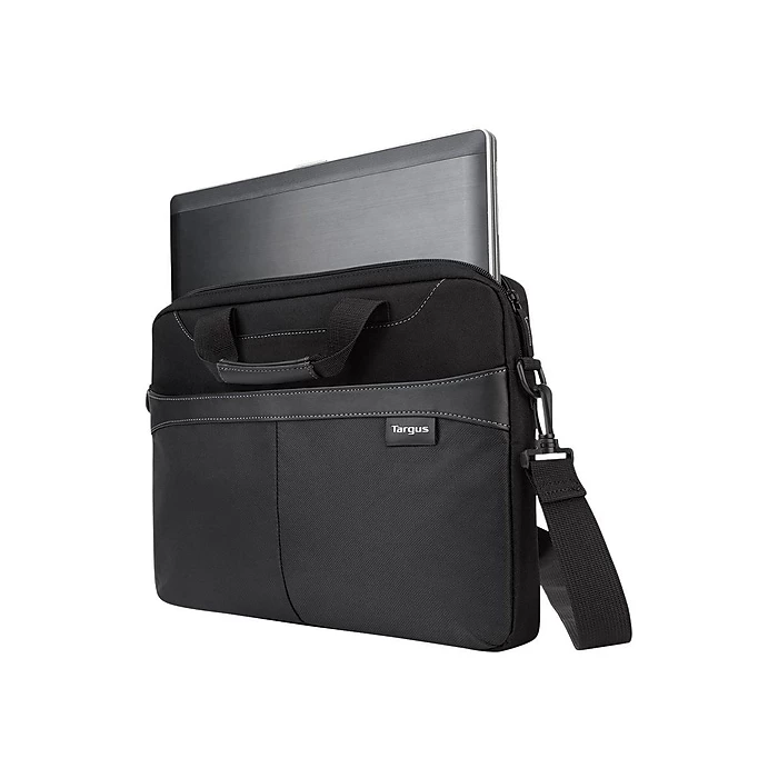 The Targus® Black slipcase carrying case with polyurethane construction, has padded laptop compartment with document divider to accommodate laptops up to 15.6″ while protecting against bumps and scratches. Case measuring 13″ x 16″ x 2.1″, has zippered front pocket to store your charger, Smartphone and other accessories. Carrying case featuring a lightweight, thin-profile design, has trolley strap with hook and loop closure that slips onto roller bags for easy travelling. A padded compartment keeps documents and magazines handy while a removable shoulder strap and soft-grip handles ensures convenient carrying.