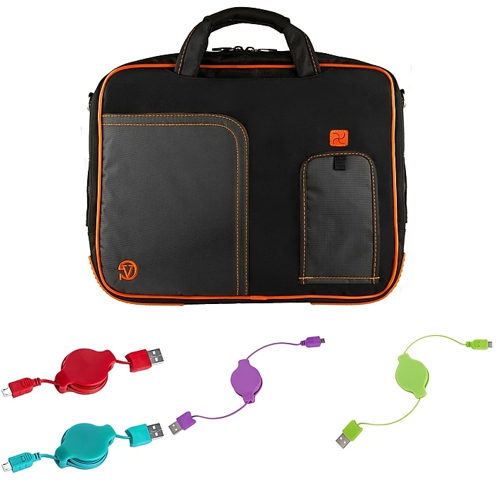 Office Business Travel Laptop Case up to 14 inch laptop + 4x MicroUSB Charging Cables. Shoulder Bag fits up to 14 inch laptop Carry and protect your surface pro and accessories in style with this shoulder bag. This ultra lightweight and stylish shoulder bag is made with well-knit dual zippers. Compact laptop case with padded shoulder strap and handles that compact into the bag Easily store phones or MP3 players up to 5.75in X 3.25in in size and text, change songs, view and reply to emails etc. all without removing device from the case! The see through covering does not interfere with touch screen capabilities! Both sides of the bag have a closeable slot so your device can remain in the bag while charging. Package includes FOUR micro usb retractable cables. Now you can charge your phone and tablet any time anywhere without any mess.