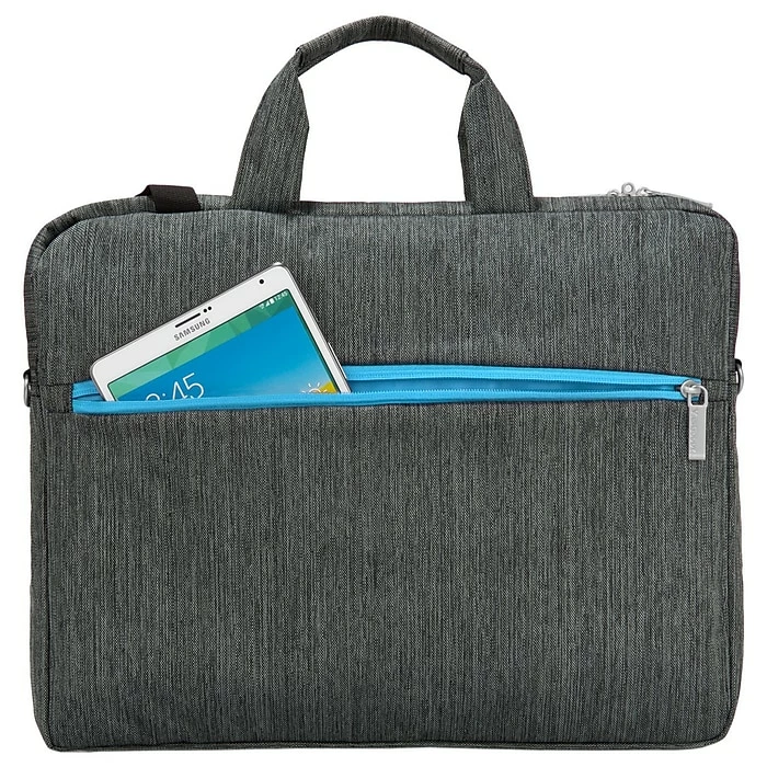 Quality Nylon Material. Adjustable and removable strap. Secure lockable zipper heads. Fits up to 15.6″ Laptops or Tablets. Front zipper pocket with small compartments inside. Back zipper pocket. Interior laptop compartment. Belt clip strap over the main zipper compartment to keep your belongings secured and safe. Adjustable Strap: 45.25in (114.935cm). Drop: 36in. Exterior Dimension: W: 16.75in L: 1.75in H: 12.75in. Interior Dimension: W: 15.7in L: 1.5in H: 12in.